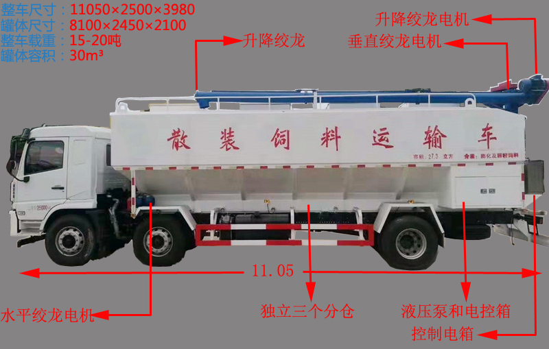 (4)料罐容積30-35方,4個(gè)獨(dú)立倉(cāng),實(shí)載:豬料 17-19噸,雞料19-21噸