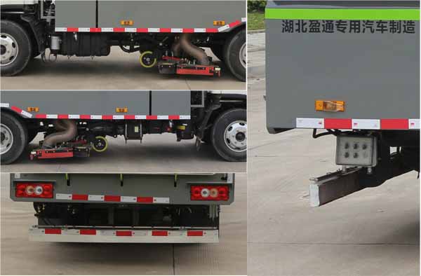 該車主要作用于路面的吸塵作業;專用裝置為吸塵裝置、垃圾箱;隨底盤選裝駕駛室;側防護為專用裝置代替,后防護材料為:Q235碳鋼,連接方式為:螺栓連接,后部防護截面尺寸(mm):120×50,后部防護離地高度(mm):350;ABS系統控制器型號為CM4XL-4S/4M,ABS系統控制器生產企業為廣州瑞立科密汽車電子股份有限公司.選裝后置吸盤樣式時,后防護專用裝置代替,后防護離地高度150mm