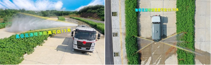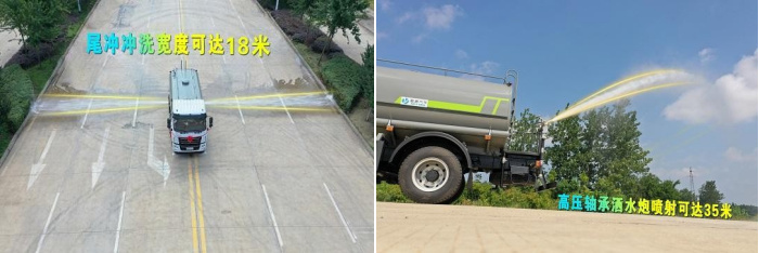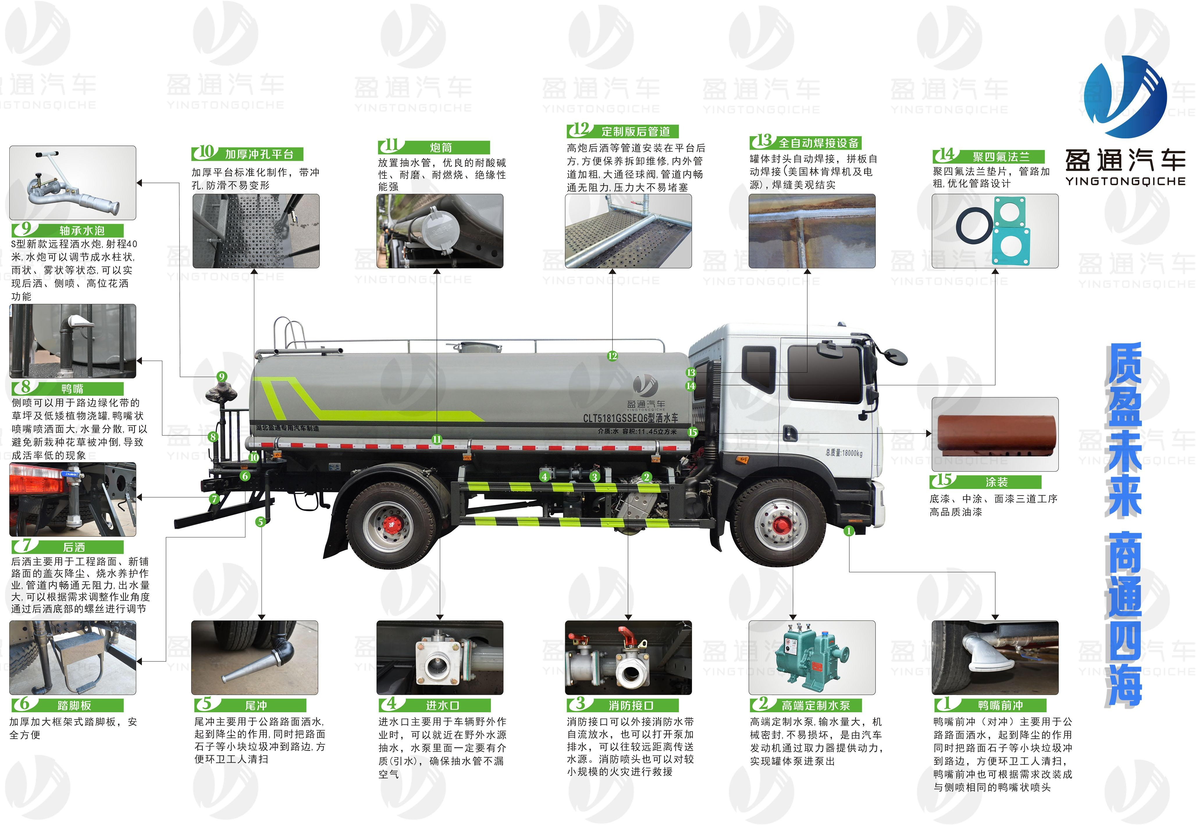 我公司產(chǎn)品標(biāo)配前噴(鴨嘴)、后沖、后灑、側(cè)噴、后置式工作平臺(tái),平臺(tái)上配置綠化水炮(可 360°旋轉(zhuǎn),既可以調(diào)成柱狀,也可以調(diào)成霧狀,更可以調(diào)成直沖狀、大雨、中雨、小雨、毛毛雨),配備優(yōu)質(zhì)大功率專用灑水泵(可自吸自排,可從河里或池塘抽水到罐體),取力器,雜物過濾網(wǎng),消防接口,自流球閥系統(tǒng)、取力器、球閥、濾網(wǎng)均為國家標(biāo)準(zhǔn)產(chǎn)品,主管道加粗,法蘭墊、法蘭盤加厚,大通徑球閥。整體具備性能優(yōu)良安全可靠、效率高、流量大、維修方便等特點(diǎn)。