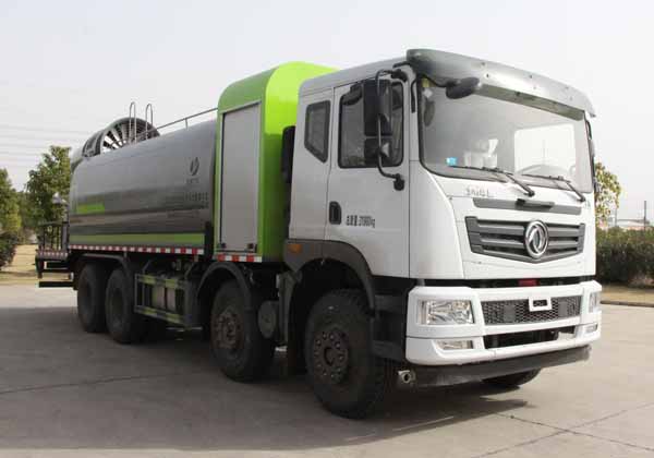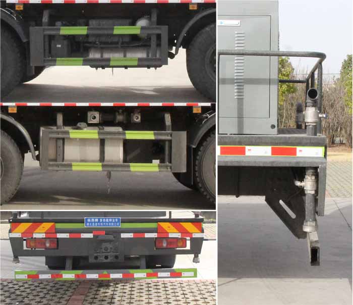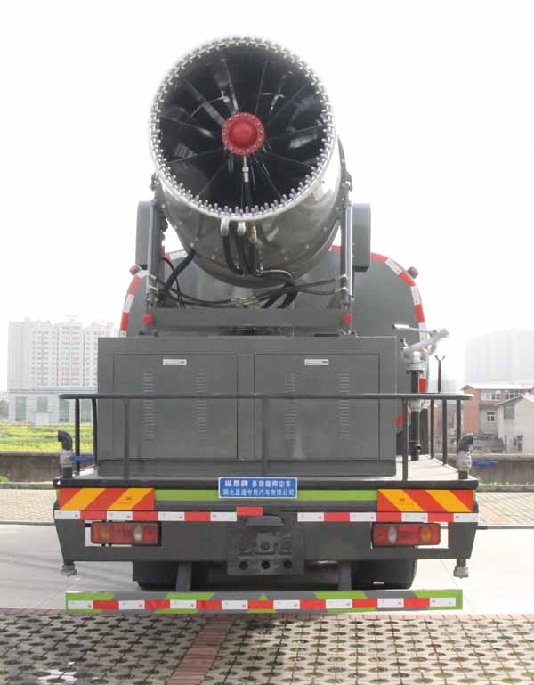 該車用途為抑塵降霾.主要裝置為罐體及噴霧裝置;罐體總容量:17.15立方米;罐體有效容積:16.33立方米;罐體外形尺寸(×長軸×短軸)(mm):5500×2480×1750.側、后防護材料均為:Q235碳鋼,連接方式均為:螺栓連接,后部防護截面尺寸(mm):120×50,后部防護離地高度(mm):490.ABS的型號及生產廠家:3631010-C2000/東科克諾爾商用車制動系統(十堰)有限公司,J ABS/焦作博瑞克控制技術有限公司.隨底盤選裝駕駛室,選裝噴霧裝置樣式,選裝擋泥板樣式.僅采用軸距(mm):1850+3200+1350改裝,整車長度為12000mm,后伸為850mm.