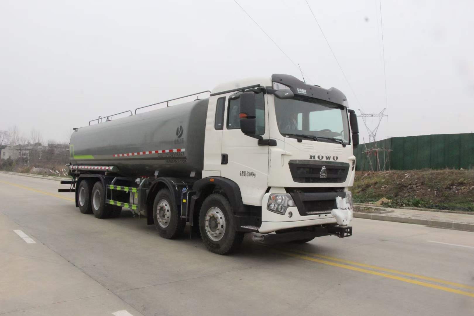 豪沃28方灑水車_重汽豪沃28方抑塵車_重汽曼350霧炮車_湖北盈通專用汽車有限公司,該車用途為城鄉道路和鐵路礦場的抑塵降霾,主要裝置為罐體及噴霧裝置.罐體總容量:22.6立方米,罐體有效容積:21.5立方米;罐體外形尺寸(×長軸×短軸)(mm):7700×2480×1730.ABS系統控制器生產企業/型號為威伯科(上海)管理有限公司/4460046300;選裝EBS,EBS系統控制器生產企業/型號為威伯科(上海)管理有限公司/EBS3.側、后防護材料均為:Q235碳鋼,連接方式均為:螺栓連接,后部防護截面尺寸(mm):120×50,后部防護離地高度(mm):490.僅采用底盤1800+3800+1350軸距(mm)改裝.隨底盤選裝前面罩,選裝后處理樣式,選裝踏步樣式.選裝前部不帶電子霧炮,選裝前部電子霧炮樣式.當前部不帶電子霧炮時,車輛長度11550mm,無前伸;當前部選裝電子霧炮時,車輛長度12050mm,前伸500mm.后軸僅采用鋼板彈簧懸架.選裝自動球閥位置,選裝后對沖裝置,選裝罐體頂部高位花灑裝置,選裝前沖裝置樣式.隨底盤選裝駕駛室.選裝噴霧裝置樣式.選裝箭頭燈裝置,選裝方形罐口及罐口位置,選裝尾部自流口裝置,選裝工具箱裝置.