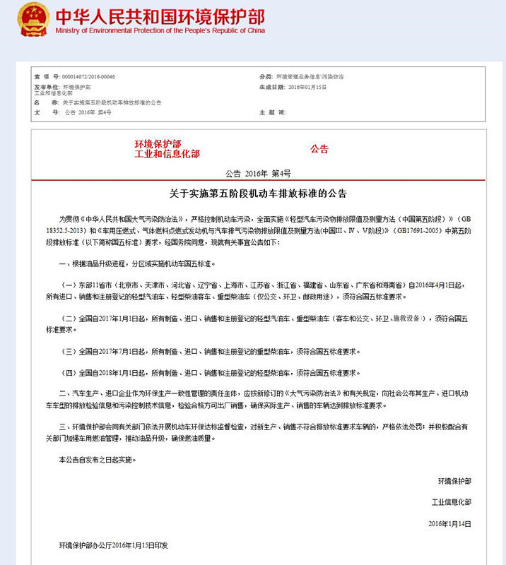 (一)東部11省市(北京市、天津市、河北省、遼寧省、上海市、江蘇省、浙江省、福建省、山東省、廣東省和海南省)自2016年4月1日起,所有進(jìn)口、銷售和注冊登記的輕型汽油車、輕型柴油客車、重型柴油車(僅公交、環(huán)衛(wèi)、郵政用途),須符合國五標(biāo)準(zhǔn)要求。