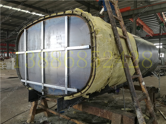 3. 保層溫的制作是在水罐外部另外焊接10mm厚的支撐骨架,然后用保溫材料將骨架內部填充滿,最后在骨架外蒙上一層外皮。 保溫層外表鐵皮采用8mm厚高強度耐磨板,可選擇使用不銹鋼分鏡面8K或磨砂板