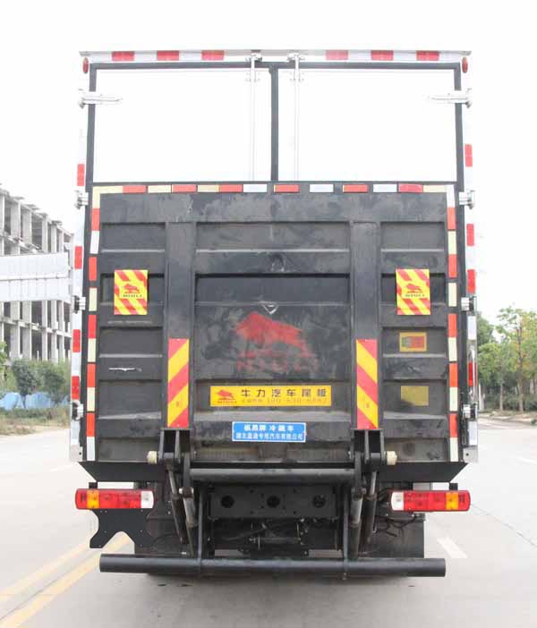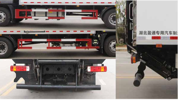 該車用于冷藏運輸的廂式汽車,裝備有隔熱結構的車廂和制冷裝置.貨廂頂部封閉,不可開啟.安裝液壓尾板,液壓尾板收起狀態的水平長度為300mm,尾板重量為550kg./后下部防護裝置,材料均為:Q235碳鋼,連接方式均為:螺栓連接;后下部防護截面尺寸(mm):直徑120,離地高度:480mm.選裝不帶液壓尾板時,/后下部防護裝置,材料均為:Q235碳鋼,連接方式均為:螺栓連接;后下部防護截面尺寸(mm):120×60,離地高度:480mm.ABS型號為CM4XL-4S/4M,生產廠家為廣州瑞立科密汽車電子股份有限公司.安裝符合規定的具有衛星定位功能的行駛記錄儀.選裝直接供電方式的ETC車載裝置.采用的發動機對應油耗值(L/100km)分別為:F4.5NS6B220/24.40,WP4.6NQ220E61/25.89,YCS06270-60/24.58.選裝其他廠家功率相當不同型號的制冷機組.整車長度/軸距/前懸/后懸對應關系為(mm):10250/5700/1290/3260,9050/5250/1290/2510,9250/5250/1290/2710,9050/5150/1290/2610,9250/5150/1290/2810,8550/4800/1290/2460,8150/4500/1290/2360.隨底盤選裝限速裝置,限速90km/h.選裝廂體側開門及位置,選裝后門樣式;隨底盤選裝駕駛室.