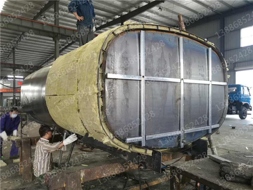 保溫熱水運水車與普通灑水車的區別,就是在水罐體外多加了一道保溫層。保層溫的制作是在水罐外部另外焊