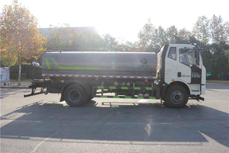 解放J6灑水車_解放15方灑水車_J6L大柴225灑水車_湖北盈通專用汽車有限公司,該車主要用于城鄉園林綠化噴灑,噴藥;主要裝置為水罐及噴灑裝置;罐體有效容積:11.45立方米,罐體外形尺寸(×長軸×短軸)(mm):5200×2300×1410;ABS系統生產廠家:長春瑞立科密汽車電子有限公司,型號:CM4XL;側、后防護材料均為:Q235碳鋼,連接方式均為:螺栓連接,后部防護截面尺寸(mm):120×50,后部防護離地高度(mm):480。隨底盤選裝駕駛室。選裝噴霧裝置樣式。