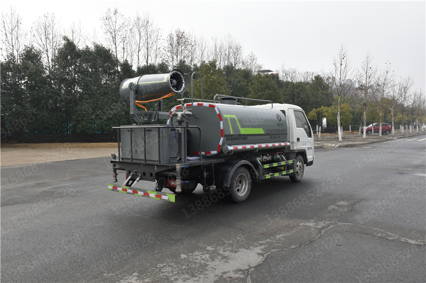 福田小卡三灑水車_福田藍牌灑水車_福田藍牌4.1方灑水車_湖北盈通專用汽車有限公司,該車用途為抑塵降霾.主要裝置為罐體及噴霧裝置;罐體有效容積:2.6立方米;罐體外形尺寸(×長軸×短軸)(mm):2600×1450×950;2600×1600×1150;ABS型號為CM4XL-4S/4M,生產廠家為廣州瑞立科密汽車電子股份有限公司;側、后防護材料均為:Q235碳鋼,連接方式均為:螺栓連接,后部防護截面尺寸(mm):120×50,后部防護離地高度(mm):360.隨底盤選裝駕駛室,選裝噴霧裝置樣式。