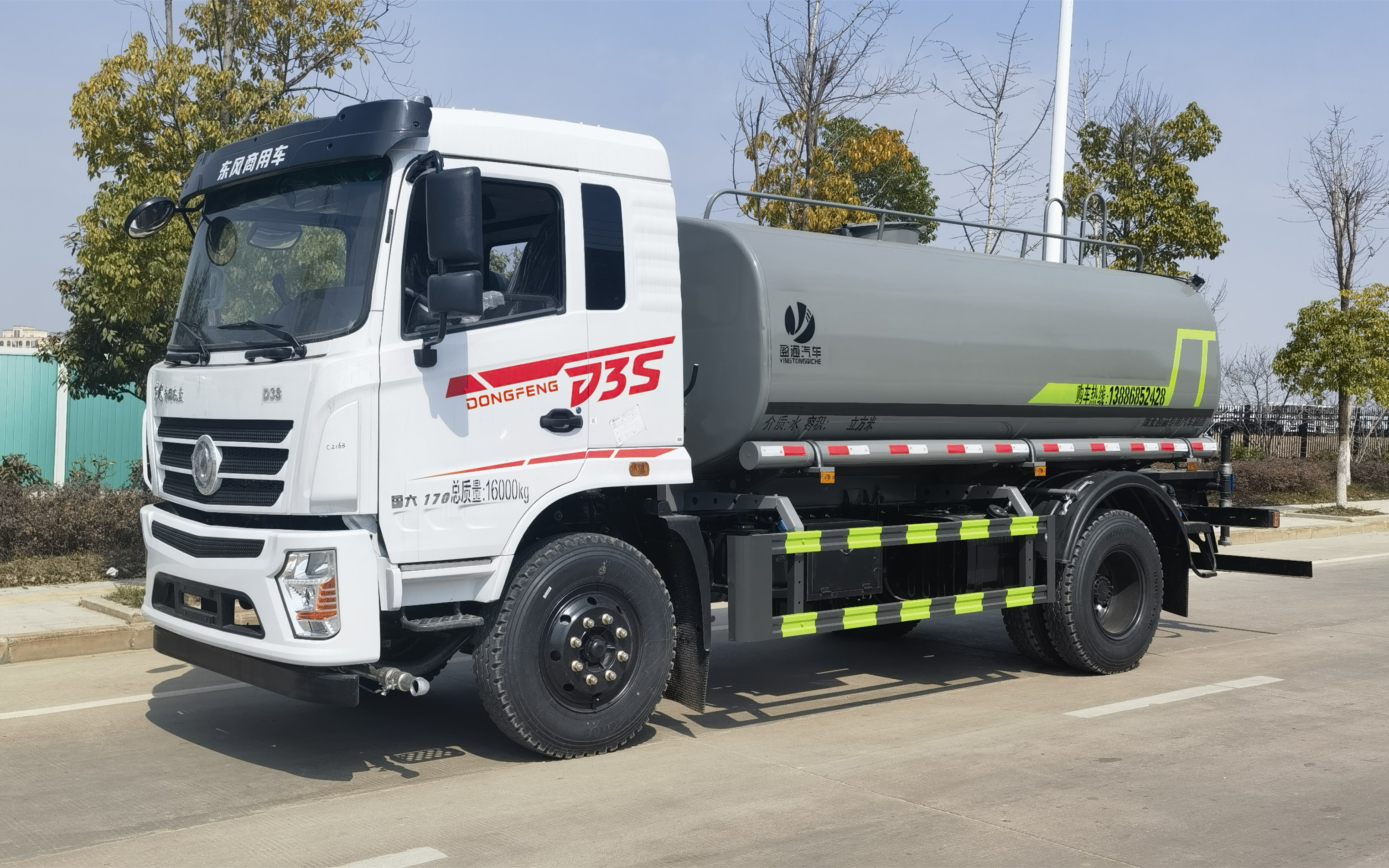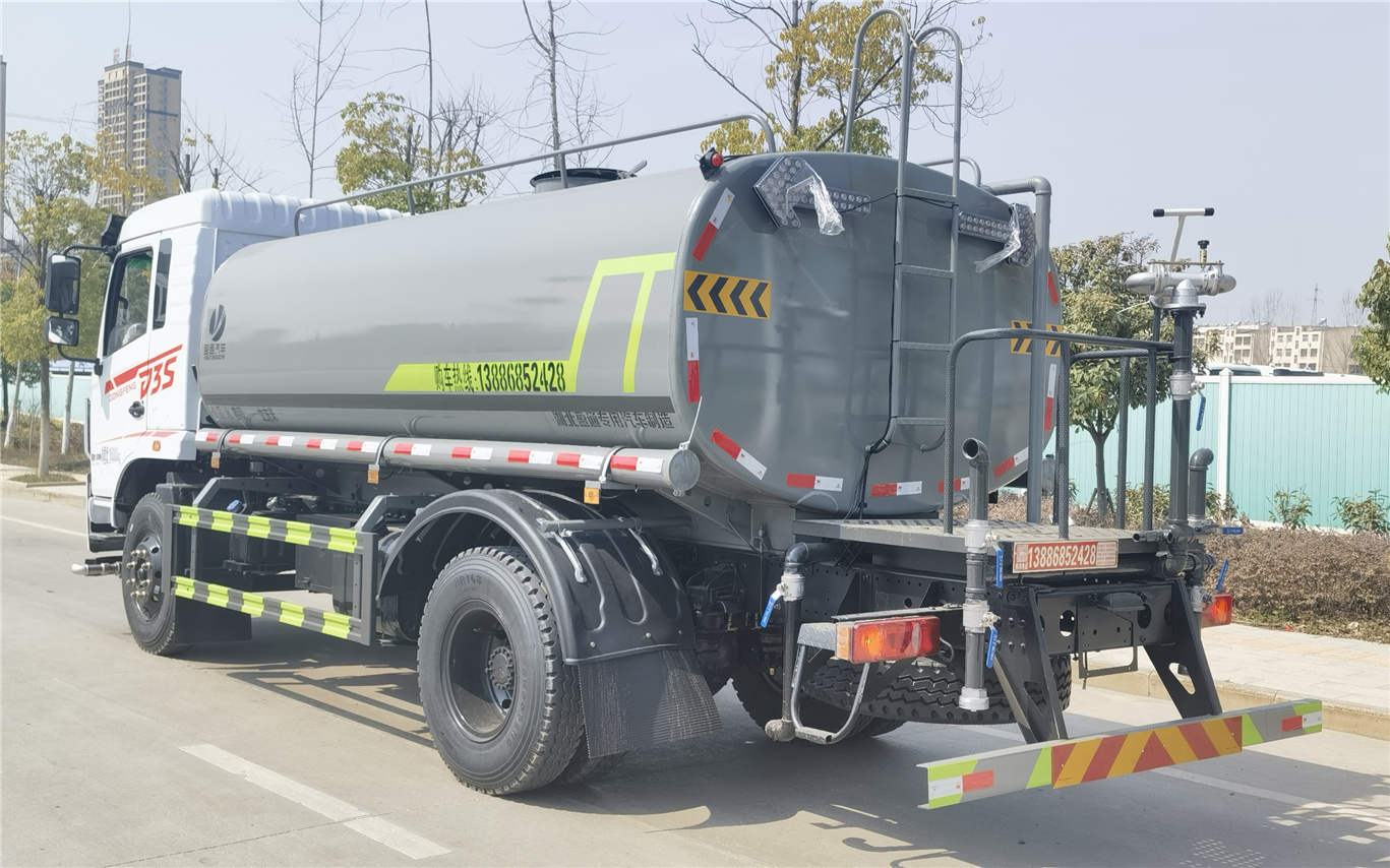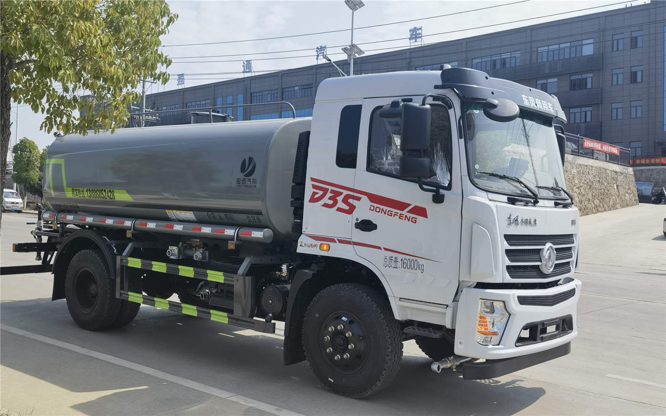 東風專底D3S灑水車_專底12方灑水車_專底玉柴170灑水車_湖北盈通專用汽車有限公司,選裝噴霧裝置樣式;ABS型號:3631010-C2000,ABS-E 4S/4M;ABS生產企業:東科克諾爾商用車制動系統(十堰)有限公司,威伯科汽車控制系統(中國)有限公司;隨底盤選裝駕駛室,選裝噴灑裝置;側、后防護材料均為:Q235碳鋼,連接方式均為:螺栓連接,后部防護截面尺寸(mm):120×50,后部防護離地高度(mm):450;罐體有效容積:9.64立方米;罐體外形尺寸(×長軸×短軸)(mm):4000×2300×1540,4200×2300×1450;該車主要用于城鄉園林綠化噴灑;主要裝置為水罐及噴灑裝置;選裝罐體頂部高位花灑裝置及罐體頂部箭頭燈裝置,選裝氣動球閥安裝位置,選裝車輛前部鴨嘴噴灑裝置,選裝油箱電瓶安裝位置.選裝罐體頂部方形罐口,選裝工具箱.選裝前部電子霧炮樣式.選裝前部不帶電子霧炮.當前部不帶電子霧炮時,車輛長度7750mm,7800mm,無前伸;當前部選裝電子霧炮時,車輛長度8250mm,8300mm,前伸500mm.后部作業燈僅在作業時開啟,車輛行駛過程中不可開啟.選裝尾部自流口裝置.